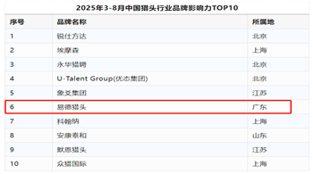 9月30日,HR价值网发布“2025年3-8月中国猎头行业品牌TOP10”榜单,易德猎头荣耀登榜。