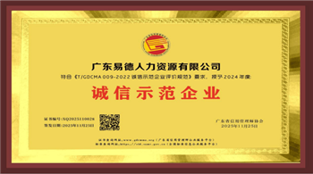 2025年11月27日,易德猎头凭借卓越的企业信用和规范经营,荣获广东省信用管理师协会颁发的“诚信示范企业”称号...